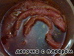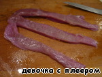 Вырезку нарезать на длинные тонкие (сантиметра 1,5) пласты. Каждый пласт не до конца по длине разрезать на 3 части.
