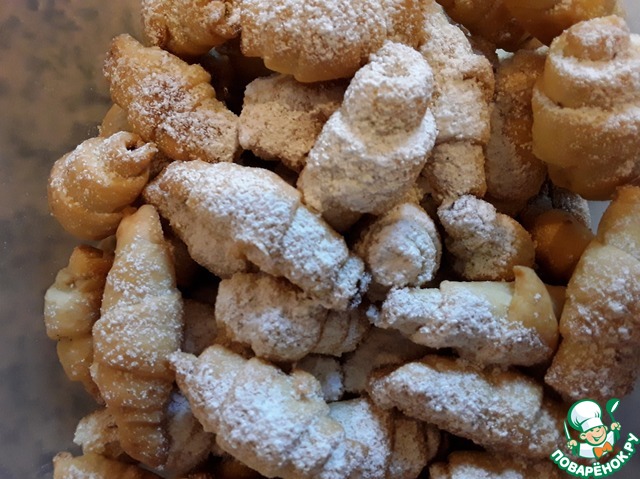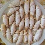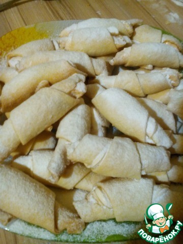 Выпекать в духовке до золотистого цвета при 180-200 градусах. Готовые рогалики посыпать сахарной пудрой.