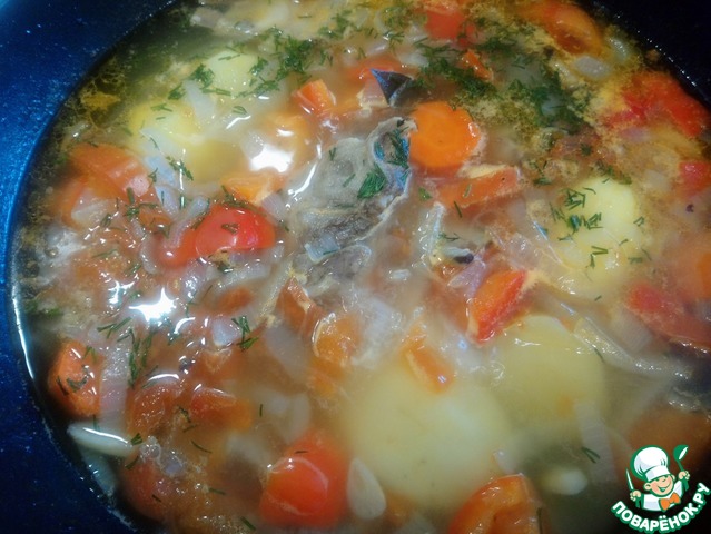 Готовый суп снимаем с огня. В тарелки выкладываем мясо, овощи, доливаем бульон, посыпаем рубленой зеленью и молотым перцем.