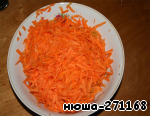 На лук выкладываем морковь и нарезанный тонкими пластинами чеснок.