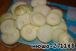 Мясо кладем в пакет для запекания, сверху раскладываем разобранный на кольца лук.