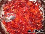 Свеклу тоже нарезаем соломкой или трем на крупной терке (кому как больше нравится).