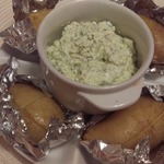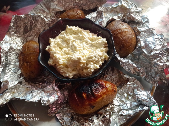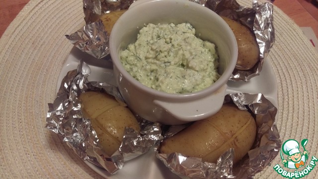К картошке подаю соус: смешиваю мягкий творог, чеснок, рубленную зелень.