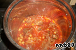 Добавить горох (предварительно замоченный в воде на ночь) и томатную пасту.