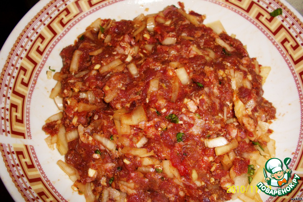 В фарш добавить мелко нарезанный лук, чеснок, базилик, соль и приправы.