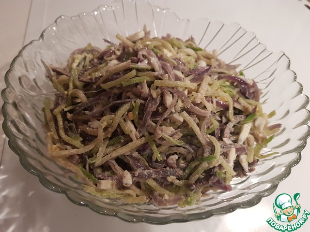 1. Редьку очистить и очень тонко нашинковать соломкой. В моем случае я натерла редьку на крупной терке.