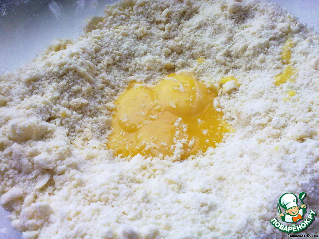Смешать муку, масло, разрыхлитель, 1 стакан сахара, ванилин до образования однородной крошки.