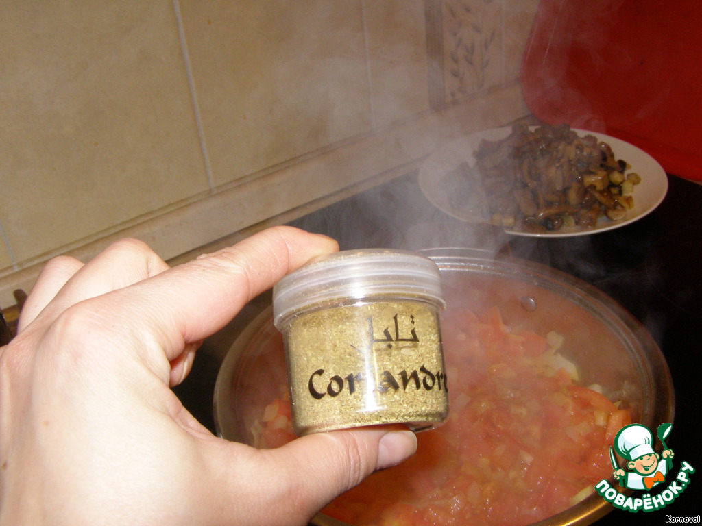 Теперь самое интересное. У меня не было чипсов, поэтому я взяла ложку томатной пасты, загустила мукой, развела бульоном из сковородки и получившийся соус понемножку прибавляла к блюду: думаю, что авторы и тут немного ошиблись с ингредиентами: если вывалить 4 ст.л. воды, смешанные с раскрошенными кукурузными чипсами и томатной пастой, то в сковороде с грибами ложка не провернется.
