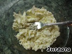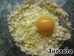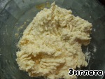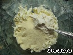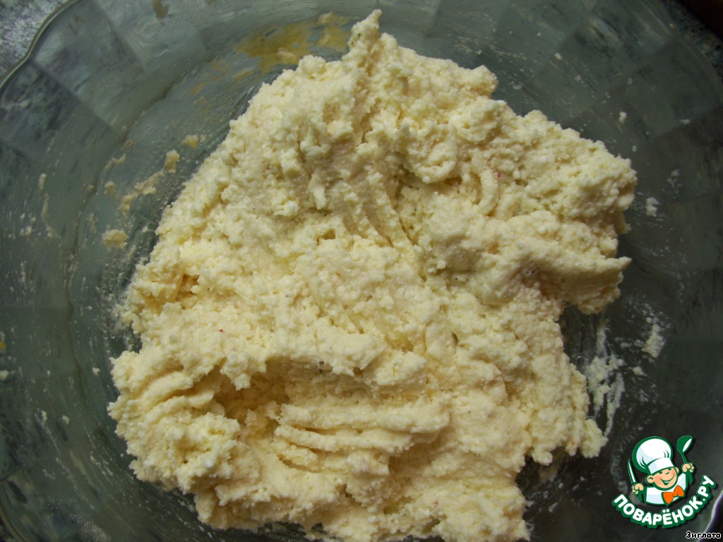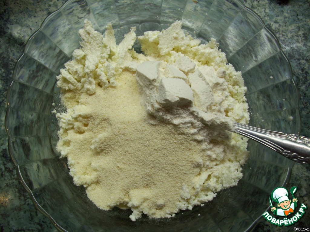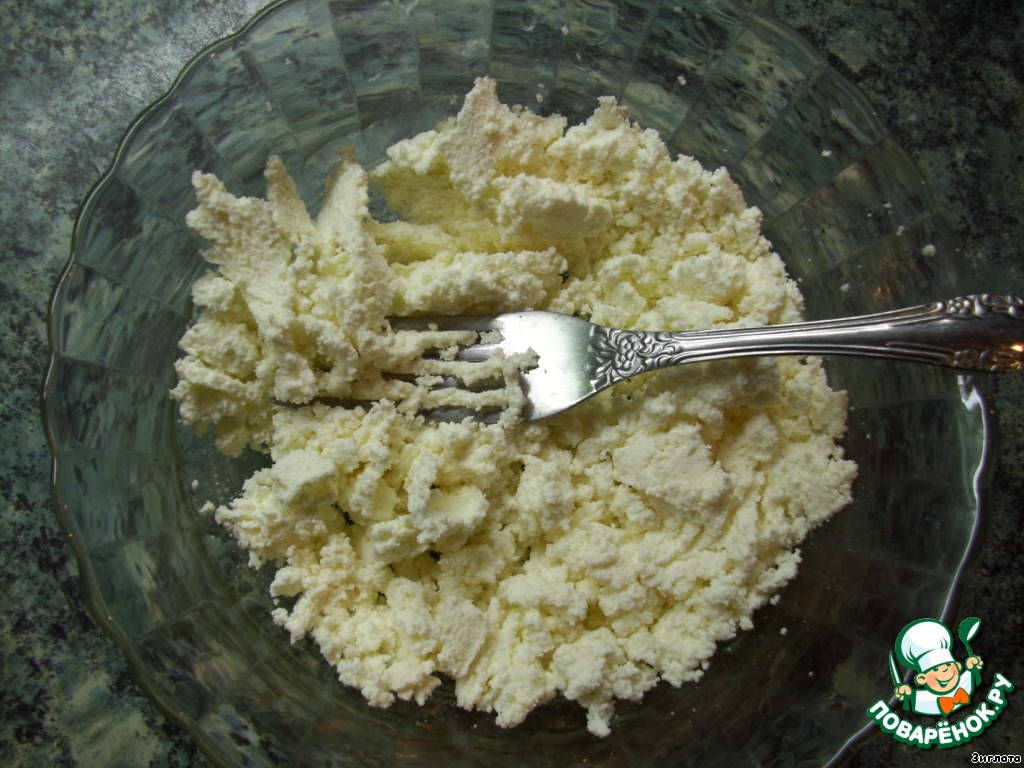 Теперь займемся клецками. Творог посолить, поперчить по вкусу и растереть,