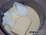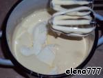 Пока печётся меренгово-миндальный корж, приготовим помадку: в металлическую кастрюльку положить сгущённое молоко, 100г сливочного масла, 100г сливочного мороженого, все растворить до однородной массы на среднем огне.