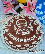 Верх и бока я украсила белковой массой (айсингом): взбить 1 белок с 1 стаканом сахарной пудры и щепоткой лимонной кислоты. Для объёмных деталей рисунок сделать на пергаменте заранее и подсушить. Вот такой именной тортик я приготовила для нашего любимого ПОВАРЁНКА!