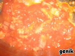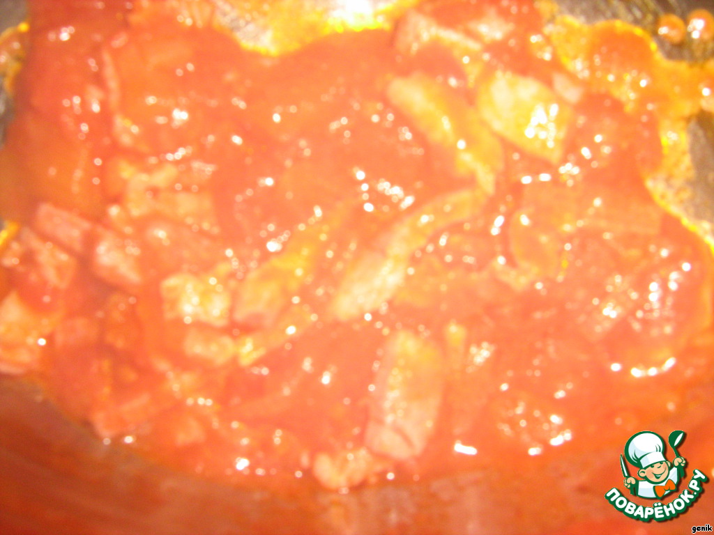 Добавляем измельченные помидоры в собственном соку, солим, добавляем острый красный перец по вкусу и варим на медленном огне 20 мин.