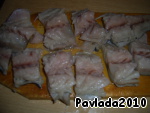 Разрезаем рыбу поперек, удаляем хребет и косточки, затем режем на средние кусочки.