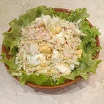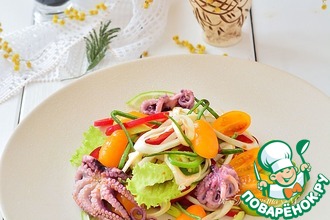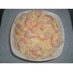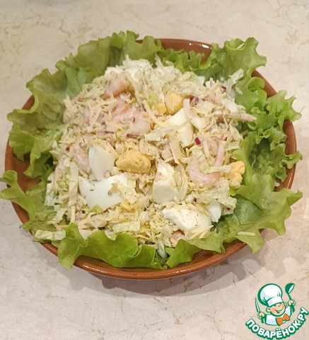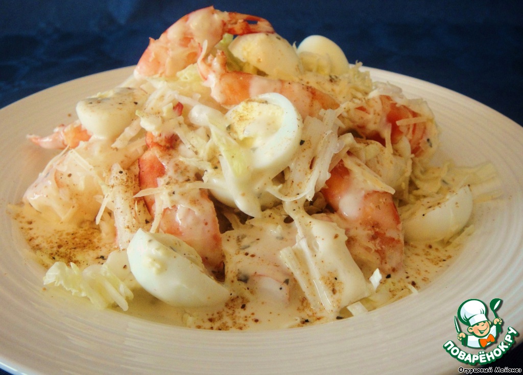 Казалось бы, простой салат! Однако, если заменить обычные креветки на гигантские, майонез на французский соус, блюдо сразу поднимается в ранге. Становится не просто интересным и презентабельным, но сразу же начинает тихонько напевать мотивы тeплых ветров и спокойных морей. Рецепт этого салата был размещeн на сайте в 2009 году пользователем Юлюнюк под названием "Морская волна" и иллюстрирован мной в рамках акции "Раскраски".