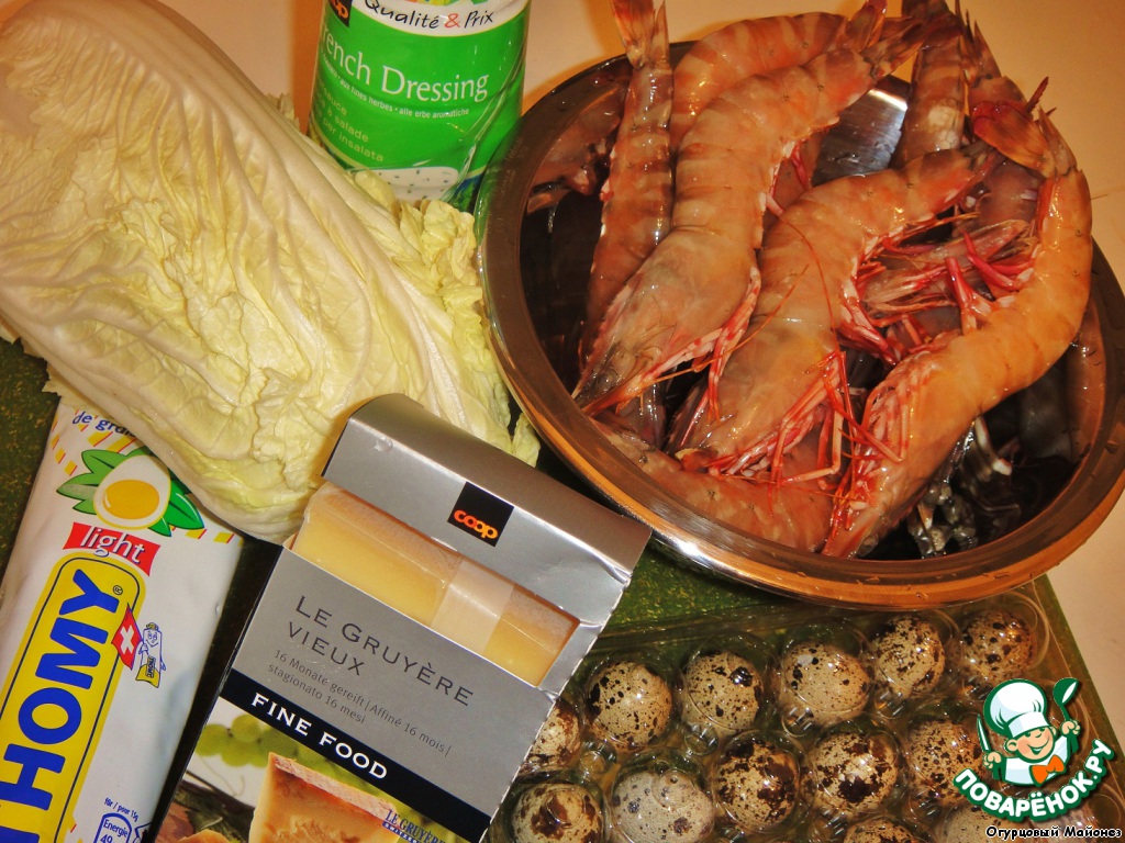 Если креветки крупные, то режем их на несколько частей, варёные яйца разрезаем пополам. Перемешиваем все ингредиенты.