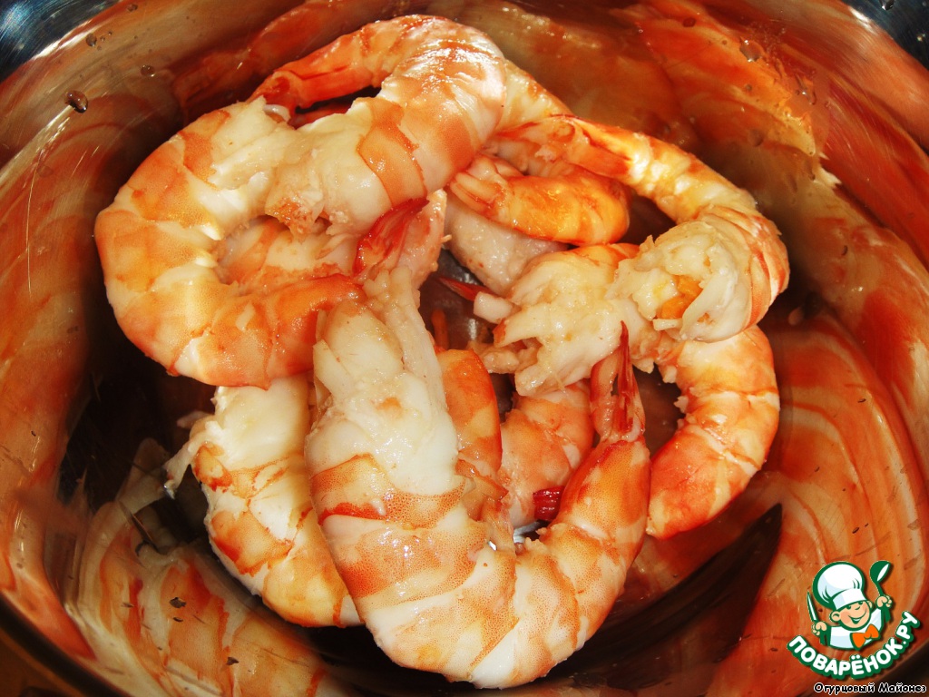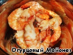 Креветки отвариваем в подсоленной воде, остужаем и очищаем.