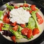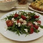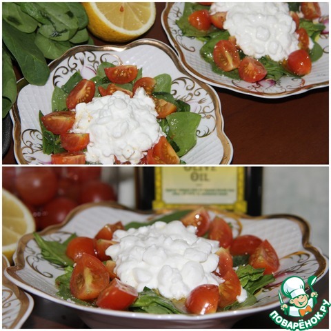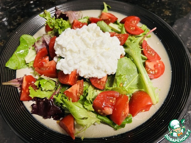 На тарелку положить помидоры и рукколу, сверху кладем 1 столовую ложку творога, вместе с жидкостью. И поливаем заправкой.