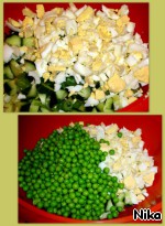 Горошек залить крутым кипятком минут на 3-5 (сразу слить воду, чтобы витамины не остались в воде).