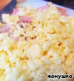 Ветчину нарезать кубиками. Сыр измельчить в блендере или на крупной терке. -