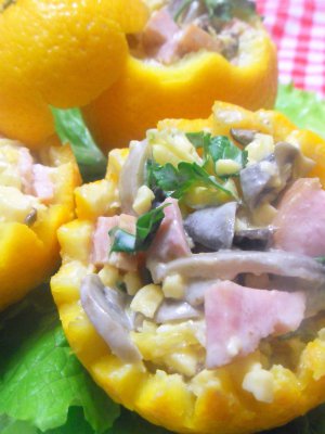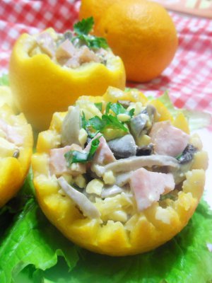 Салат выкладываем в корзинки из апельсина и украшаем по вкусу))