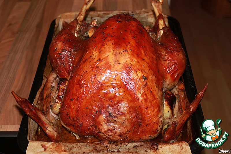 Увидела предварительное замачивание в соли и решила, что это позволит мясу под шкурой просолиться, однако - нет. Никогда не запекала индейку. Делала всё по рецепту, однако мясо получилось немного суховато (думаю, при весе 3,2 кг нужно было раньше достать из духовки), и пресно. Соус же, что стёк в посуду, солёный до горечи