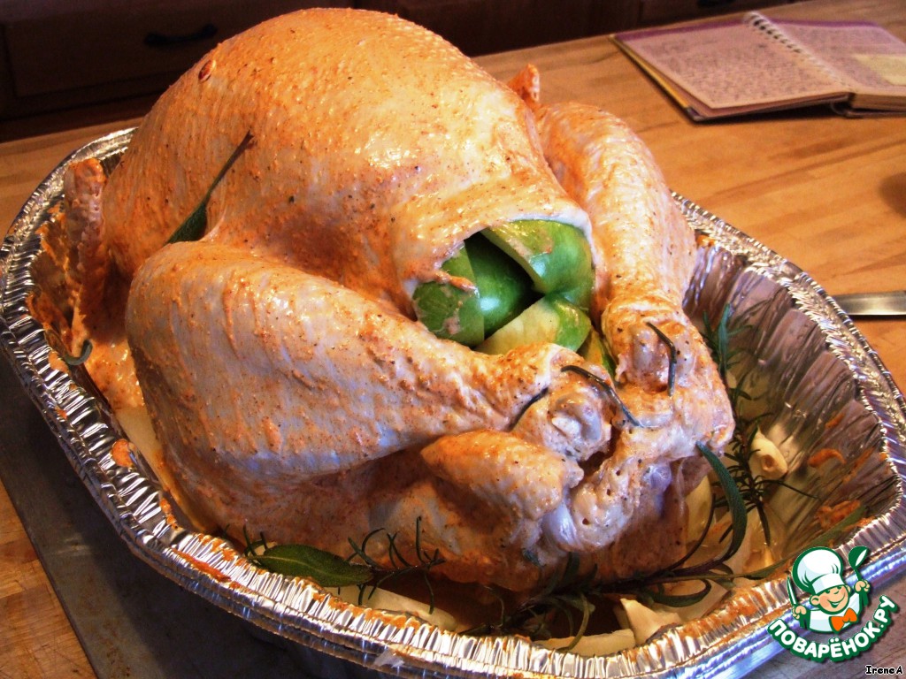В день готовки, рассчитав, в какое время птицу нужно поставить в духовку, включите духовку на 170-175*. Птицу нужно промыть и уложить в огнестойкую посуду. После этого, смешайте несколько ложек майонеза с солью, перцем, паприкой и приправой для курицы и смажьте индейку изнутри и снаружи. Теперь её нужно нафаршировать. Я беру нарезанные на 8 частей кислые яблоки и чернослив. Во-первых, я люблю печёные яблоки, а во-вторых, они помогают содержать индейку сочной. Есть люди, которые начиняют индейку начинками из риса или хлеба, но эти начинки только высасывают всю сочность из мяса. Когда индейка нафарширована, добавляем в посуду нарезанный на несколько частей лук, головку чеснока, веточки розмарина и шалфея и 1 стакан вина. -