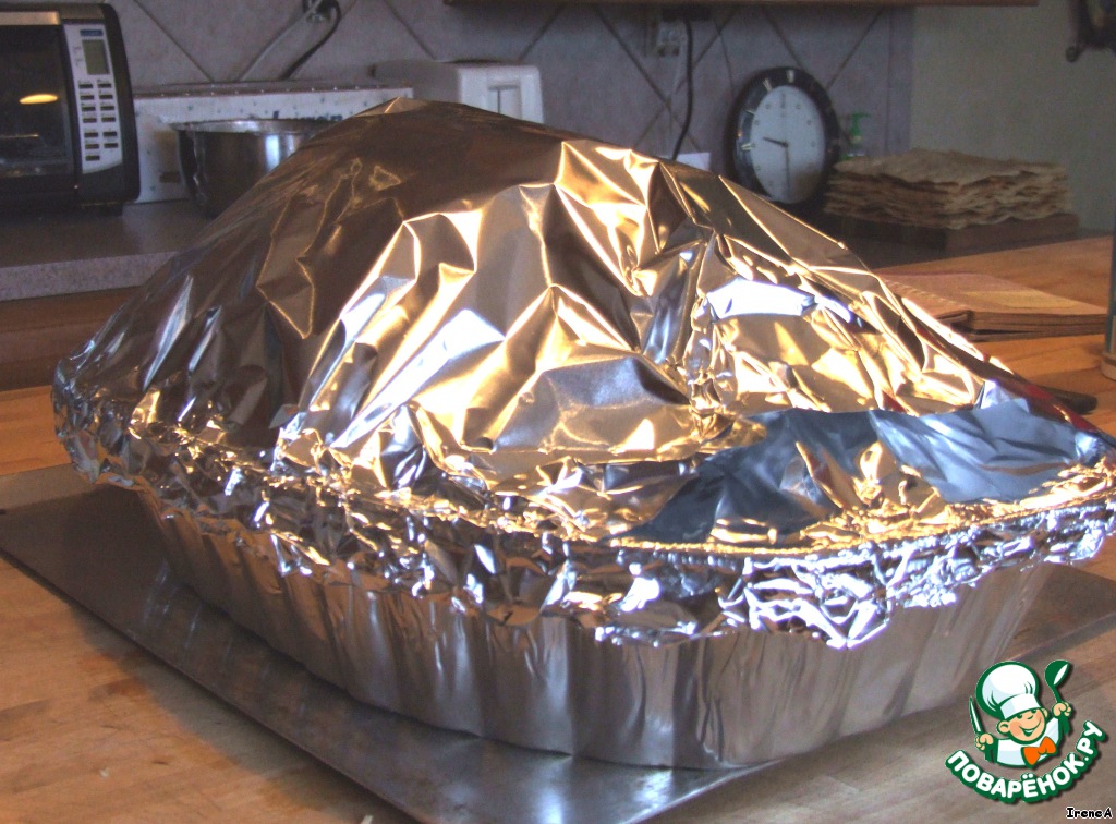 После этого очень хорошо замотайте все фольгой и ставьте птицу в духовку.