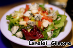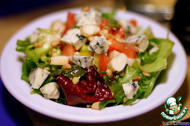 Cухие и холодные листья салата заправила винегретом, добавила овощи, сыр (крим с голубои плесенью), который там оказался ни туда, ни в красную армию, но уже положила, и орешки (кедровые + бразильские)..