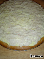 Разъемную форму (28см) застилаем пищевой бумагой, на нее выкладываем и разравниваем тесто, выпекаем при температуре 180 град. до золотистого цвета.