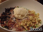 Добавить мелко нарезанный лук, почищенное и нарезанное на мелкие квадратики яблоко, изюм, мелкие кусочки хрустящего бекона или мелко нарезанное копчёное мясо.