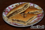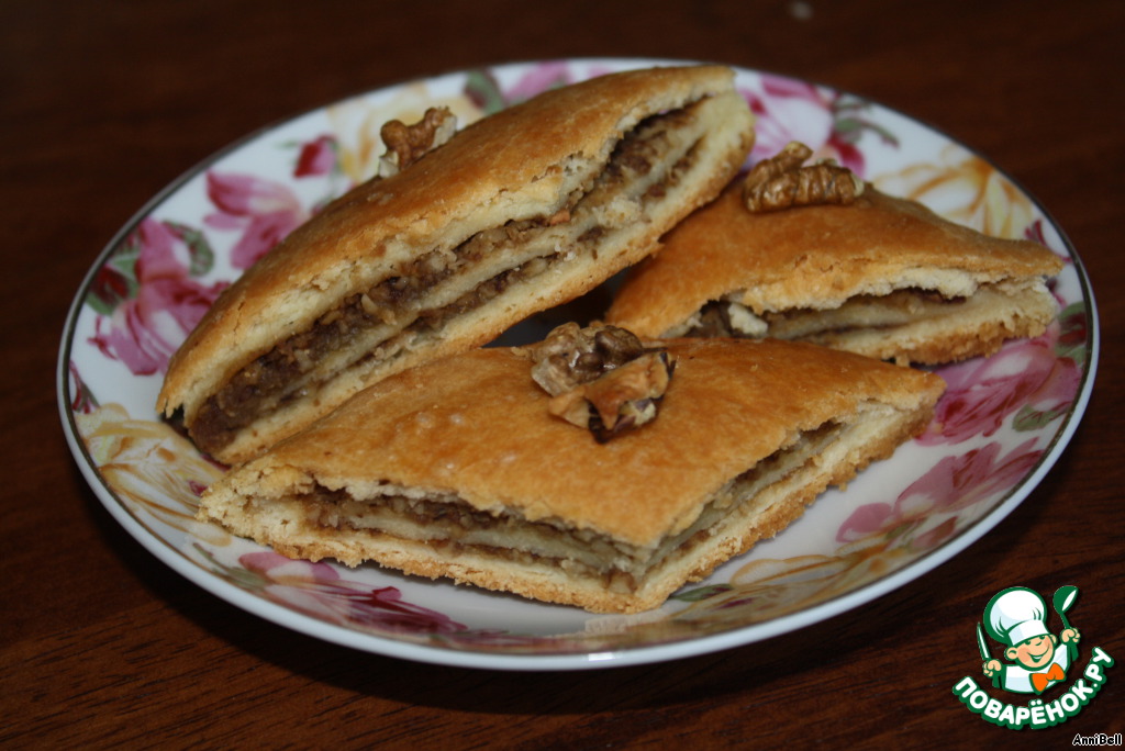 Разрезать получившейся пирог в сыром виде на порционные куски, каждый украсить орехом. Выпекать при 200 градусах 20 -25 мин. Горячий пирог смазать 3 ст. ложками меда и отправить в духовку на 5 мин. Блюдо готово!