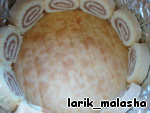 Рулет нарезать на небольшие кусочки и разложить по диаметру формы по краю.