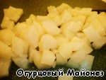 Сливаем сироп из банки с консервированными грушами, а сами груши нарезаем кубиками.