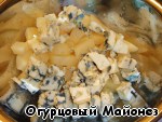 Добавляем нарезанный кубиками голубой сыр и заправляем коньяком.