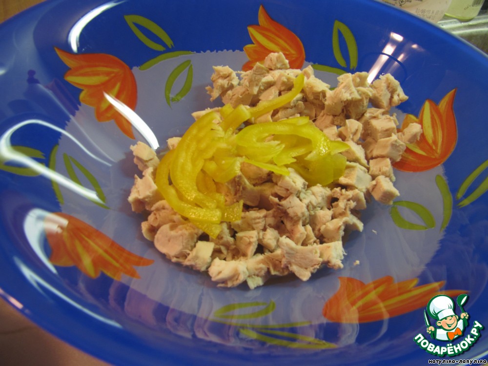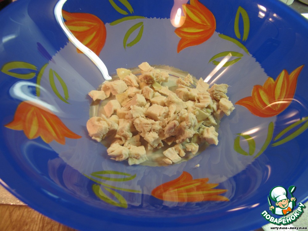 Куриное филе отвариваем, остужаем и режем кубиками.