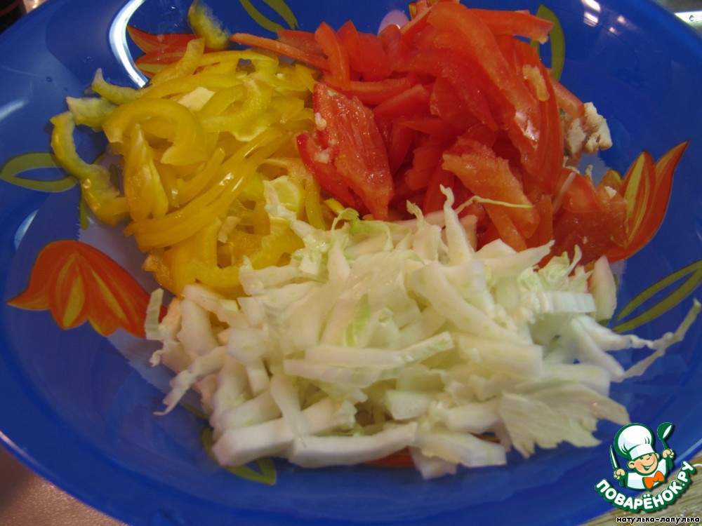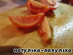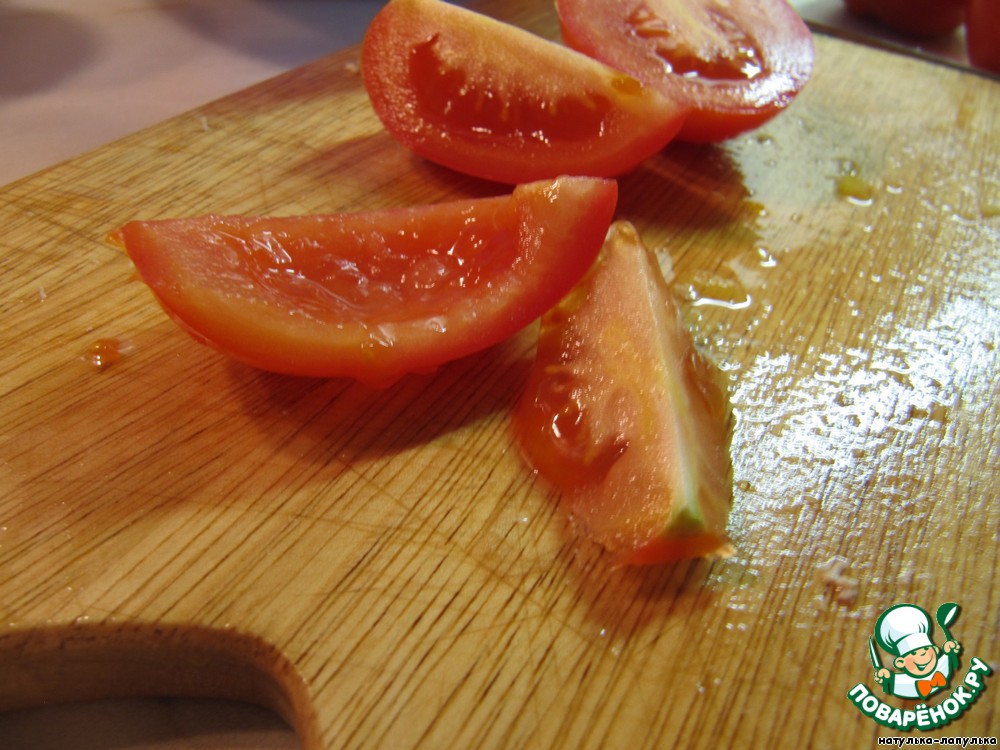 Дальше режем помидоры. Т.к. салат в итоге получается достаточно сочным, чтобы не было лишней жидкости от помидоров, я обычно делаю так: режу помидор на дольки, вырезаю внутреннюю часть с семечками.