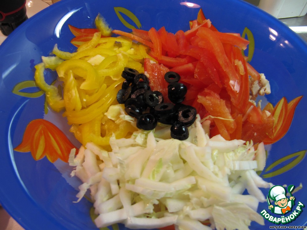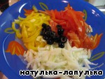 Теперь оливки. Я солила и заправляла маслом на этом этапе, потому что потом с сыром будет трудно все хорошо перемешать.