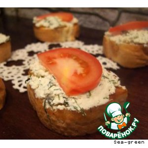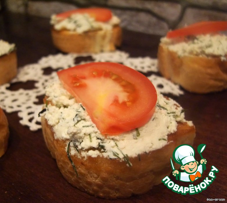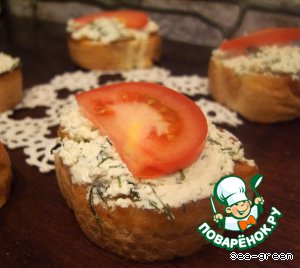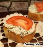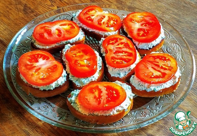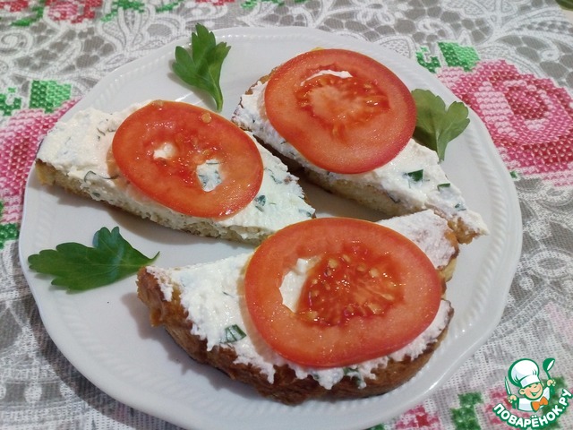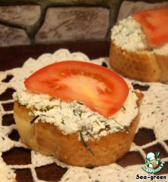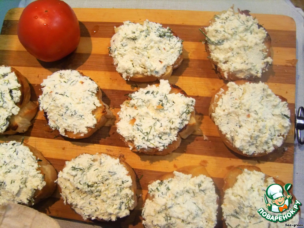Каждый обжаренный кусочек хлеба натереть чесноком, выложить сверху творожную массу.