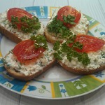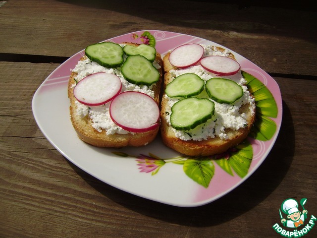 Рецепт этого блюда был размещeн на сайте в 2009 году пользователем Роня под названием "Бутерброды Египетские", и иллюстрирован мной в рамках акции "Раскраски". Получилось очень вкусно, правда, немного уменьшила количество ингредиентов и вместо огурца для украшения использовала помидор. И еще, просто творог получился немного суховат, поэтому я в него добавила чайную ложку натурального йогурта без добавок, чтобы удобнее было намазывать. Спасибо автору!!!