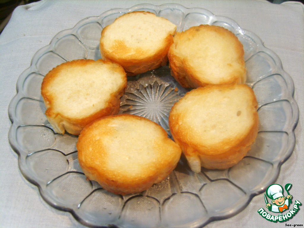 Багет нарезать и обжарить на разогретой сковороде с небольшим количеством масла. Можно также его или подсушить в духовке, или подрумянить в тостере.