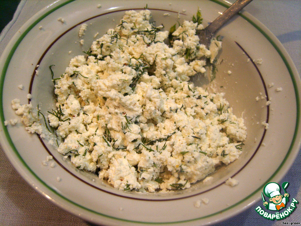 Творог размять вилкой, посолить и поперчить по вкусу. Добавить измельченную зелень. Если масса получилась сухой, то можно добавить немного натурального йогурта без добавок и все хорошо перемешать.