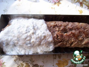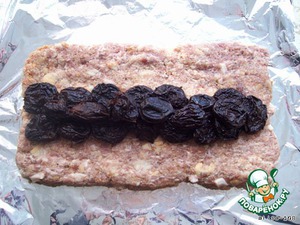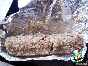 В фарш добавляем натертую луковицу, яйцо, размоченную булку, солим, перчим и как следует вымешиваем. Выстилаем фарш на фольгу и придаем форму прямоугольника.