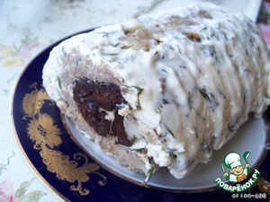 Выкладываем рулетик в форму. И готовим майонезную заливку. Для этого желатин растворяем в молоке, даем слегка остыть и смешиваем с майонезом. Солим, перчим и добавляем укроп. Все еще раз хорошо и тщательно перемешиваем. Заливаем рулет майонезом и ставим застывать в холодильник.