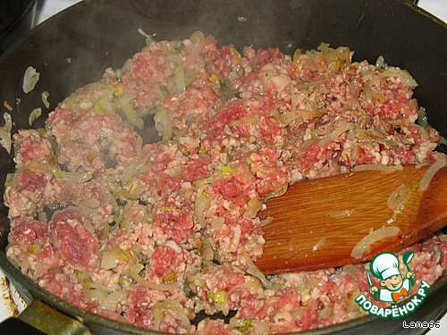 На разогретой с маслом сковороде обжарить лук до золотистого цвета. Добавить фарш и интенсивно перемешать.