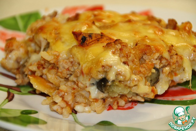 На дно стеклянной жаропрочной формы укладываем послойно половину риса,