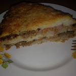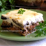 Половину соуса Бешамель. Слои повторить: рис, фарш, баклажаны и соус Бешамель.
