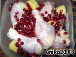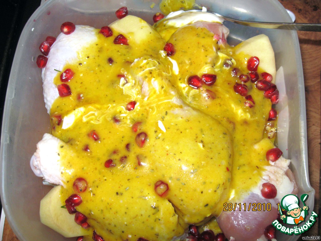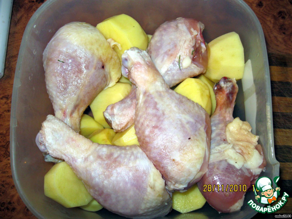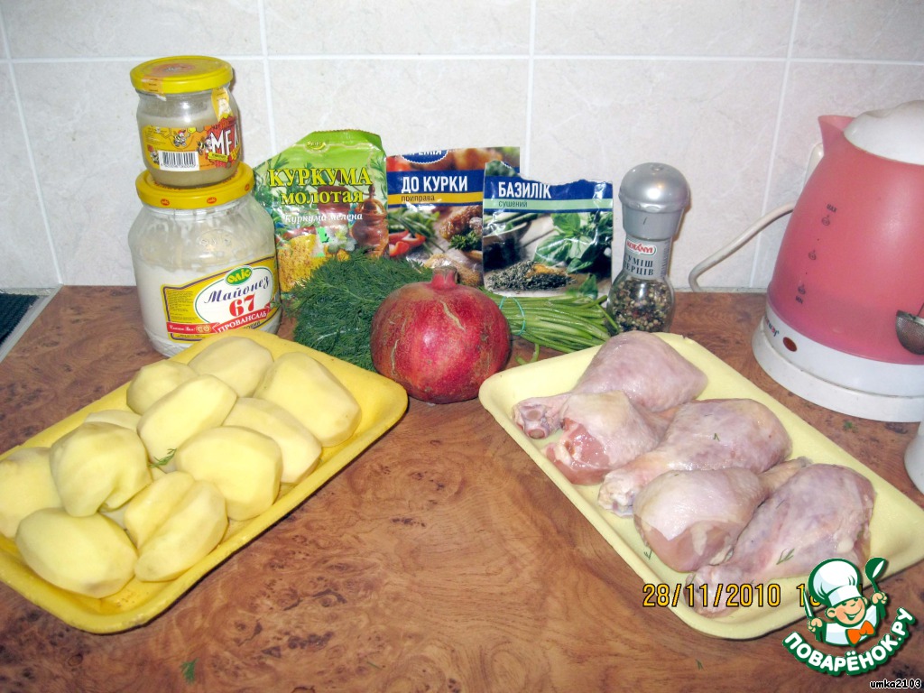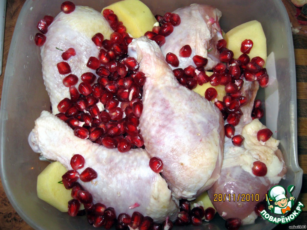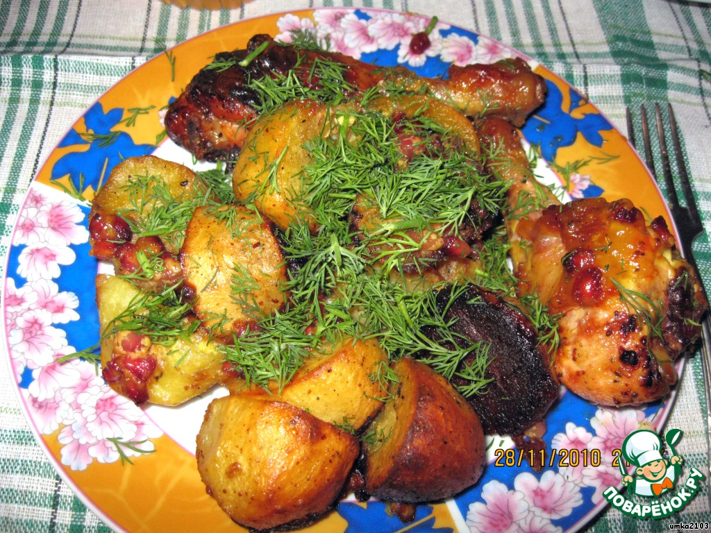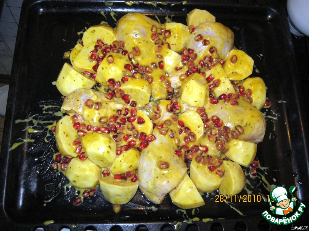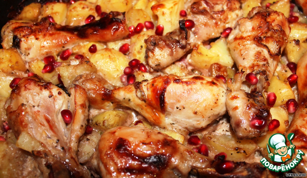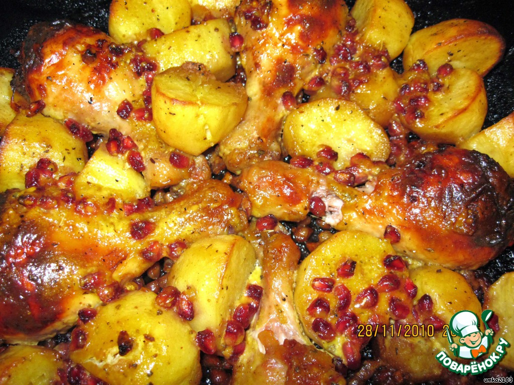 Обычно в воскресенье я стараюсь приготовить какую-нибудь вкуснятинку по рецептам этого сайта, но сегодня решила придумать что-то от себя. Из продуктов, что были в холодильнике и получился этот вкусный и сытный ужин! Я всегда знала, что куриные ножки и картошка - это беспроигрышный вариант, а с заправкой из меда и граната придала пикантный вкус этому блюду! Надеюсь, мой дебют не закидают тухлыми помидорами!