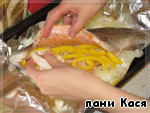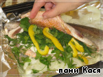 в исходнике перец, грибы, лук и укроп надо было порубить кубиками. Но я не стала, потому как кубики не держатся внутри рыбы, вываливаются. Порезала пластинками, брусочками, крупно. Овощи и грибы получились очень вкусными, не разбрелись. Маслом фольгу я тоже не смазывала, рыбка сама жирненькая. Уложила ее на слой лука, чтобы не прижарилась. -