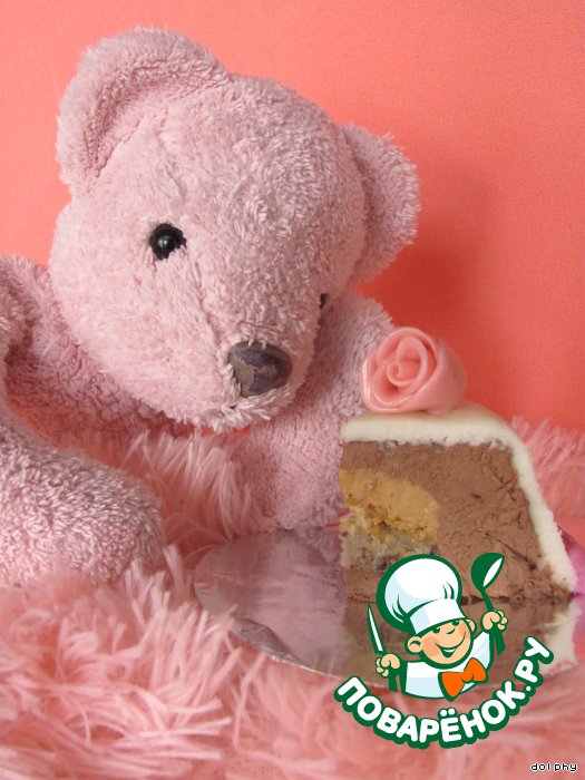 Дорогой Поваренок! Прими в подарок еще одно замечательное пирожное! Это очень нежное и воздушное шоколадное лакомство с прослойкой из карамельного крема, орехов и бананового бисквита. Шоколадный мусс не очень сладкий, поэтому его прекрасно дополняет сладкая мастика.