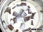 Я начала с крема, который нужно готовить за сутки до приготовления торта. На водяной бане растопить батончики Баунти или похожие на них, мои назывались "Фант", сливки и шоколад, поломанный на кусочки.
